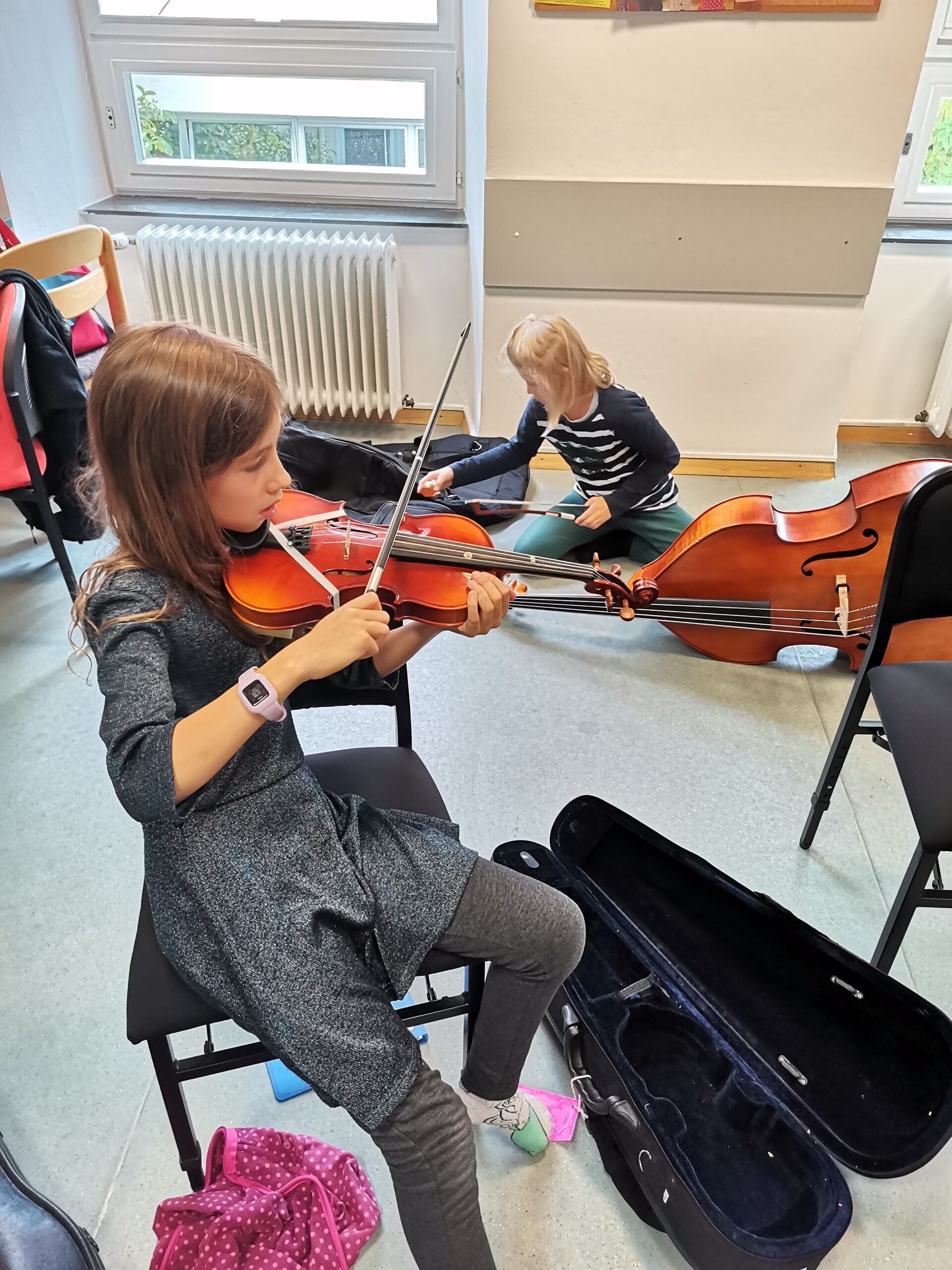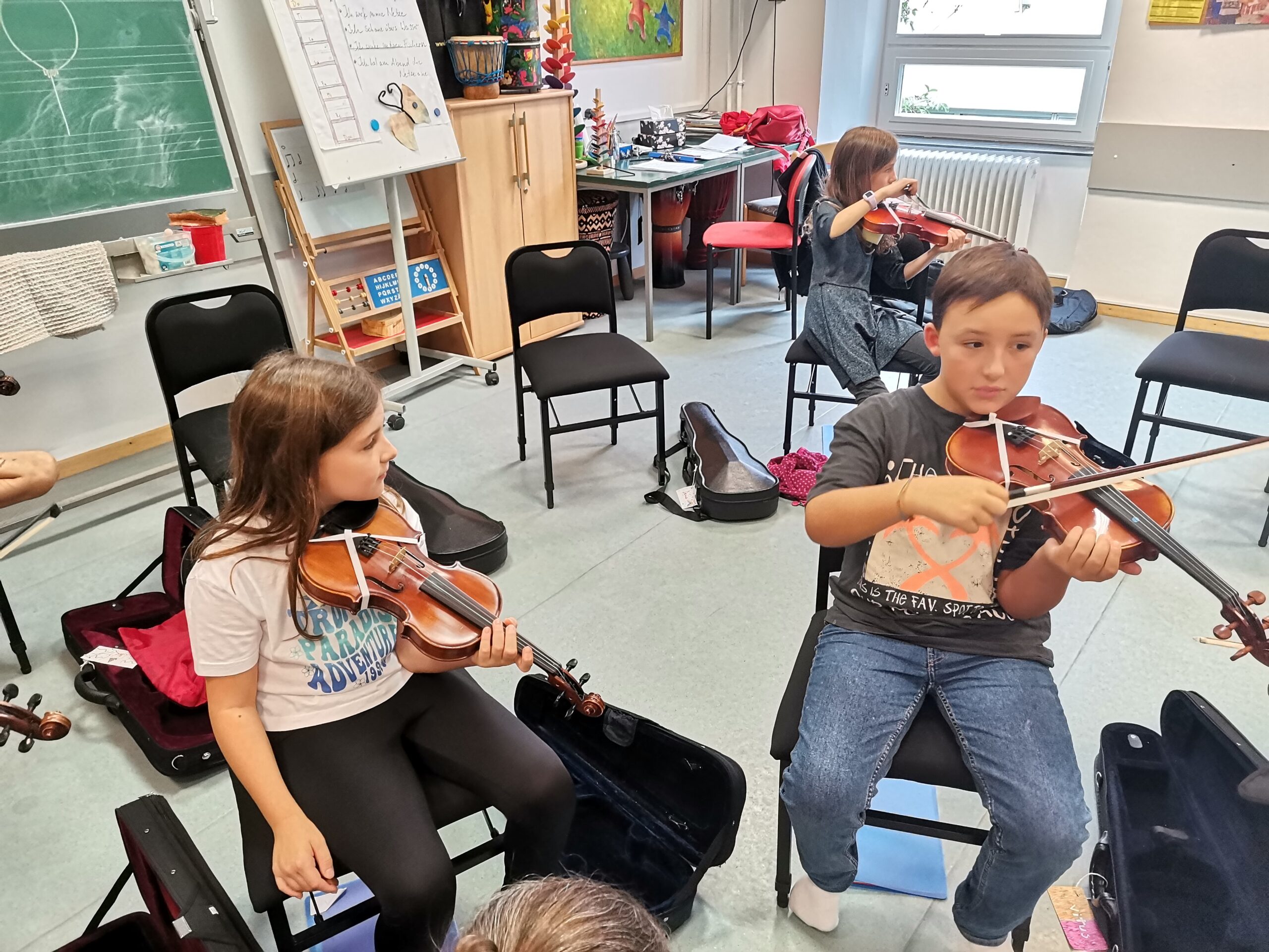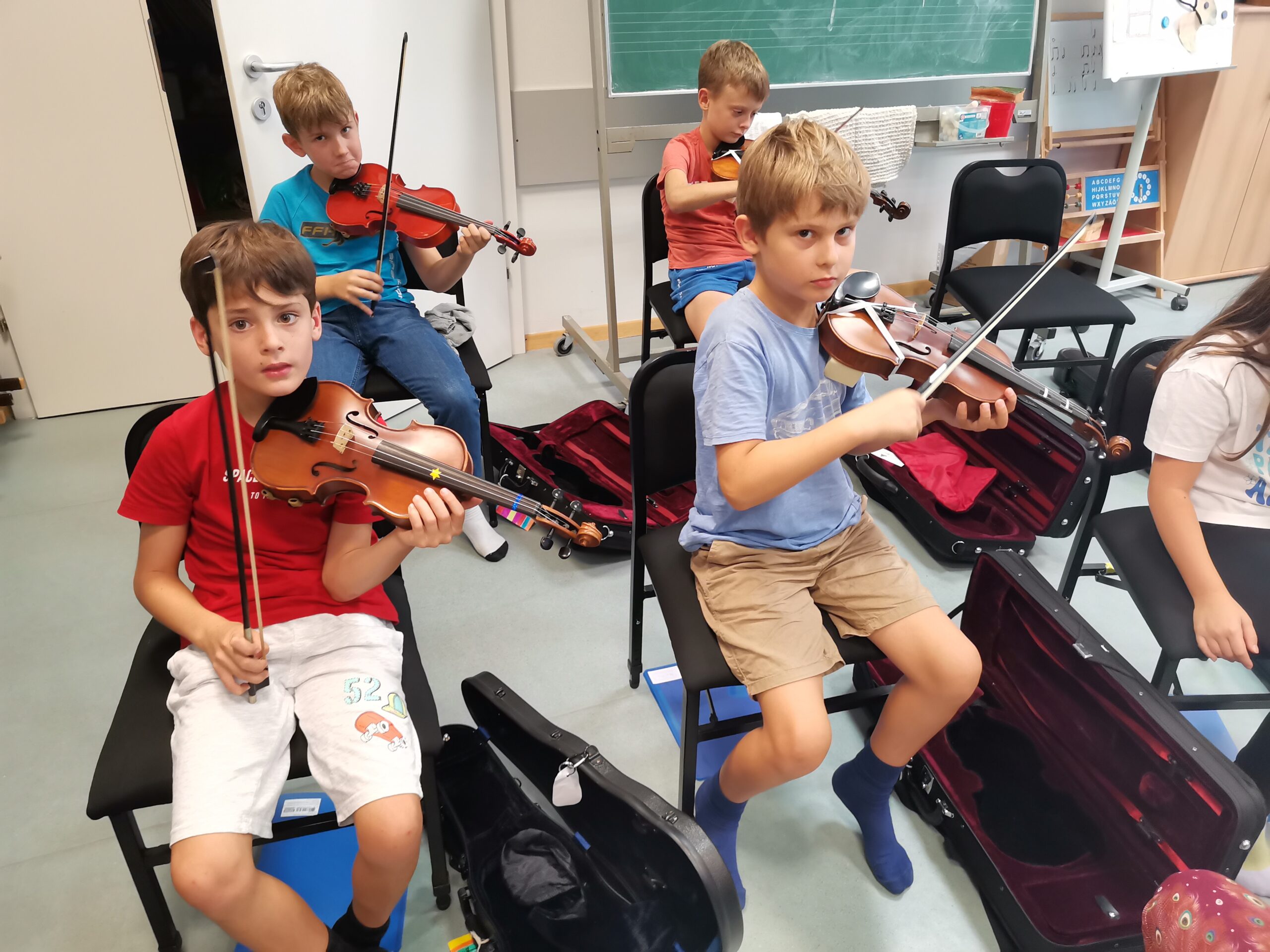 Die Kinder der 3. Klasse mussten die gesamten Sommerferien abwarten, bis sie endlich Ihre Streichinstrumente überreicht bekamen. Die Freude war groß, als sie das erste Mal auf ihrer Geige, ihrer Bratsche, ihrem Cello oder ihrem Bass musizieren durften. Zweimal wöchentlich findet der Unterricht mit Lehrern und Lehrerinnen aus der Babenberger Musikschule statt. Mittlerweile spielen sie schon ganze Lieder und es werden noch viele mehr.