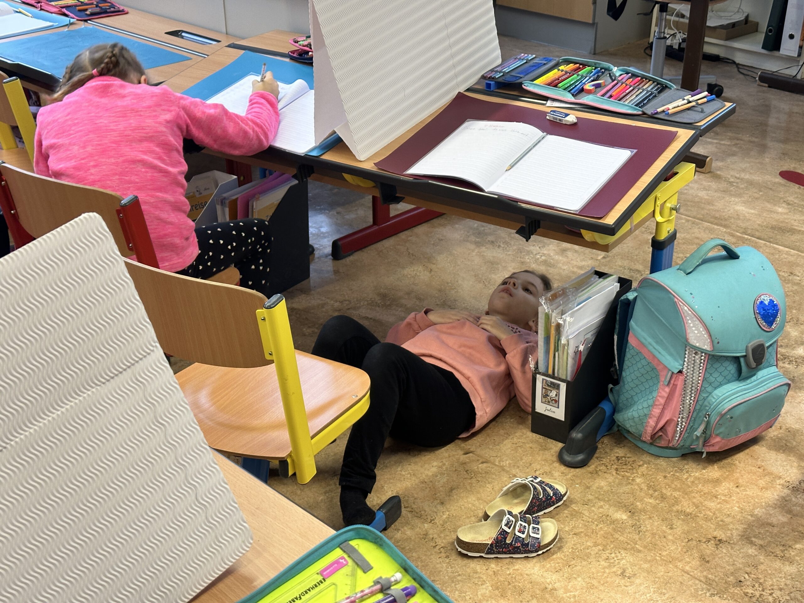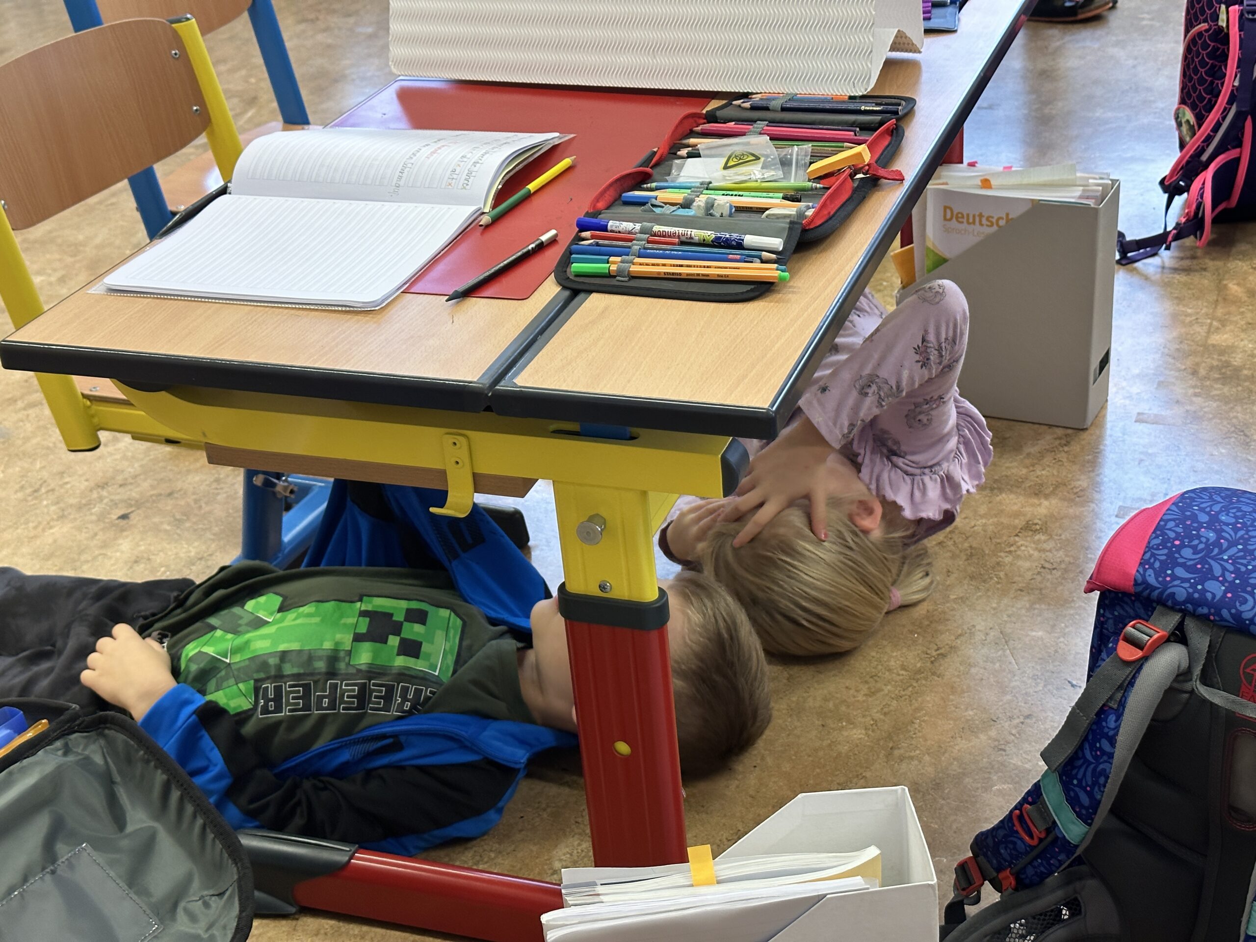Deutschunterricht in der 2bBy Katrin / 20. Feber 2024 Lernen – einmal anders: Das Tauchdiktat macht allen Spaß! Sätze mit Lernwörtern sind unter dem Tisch versteckt….