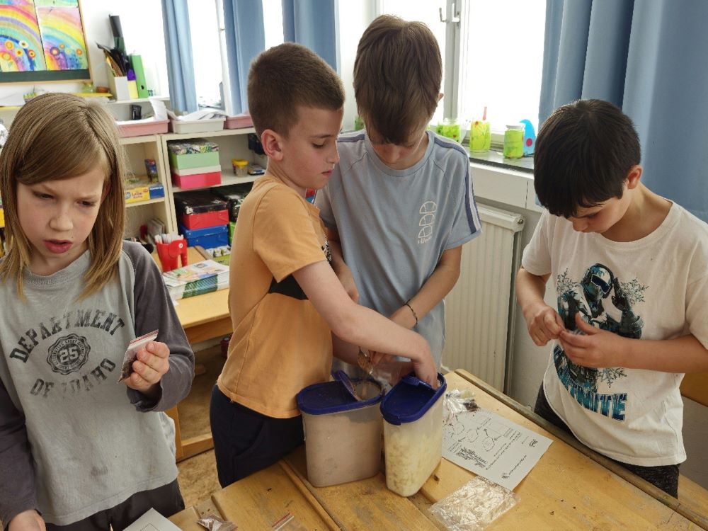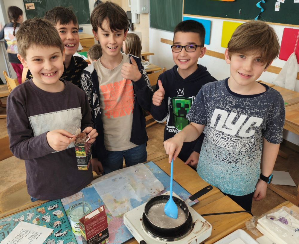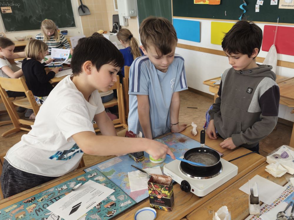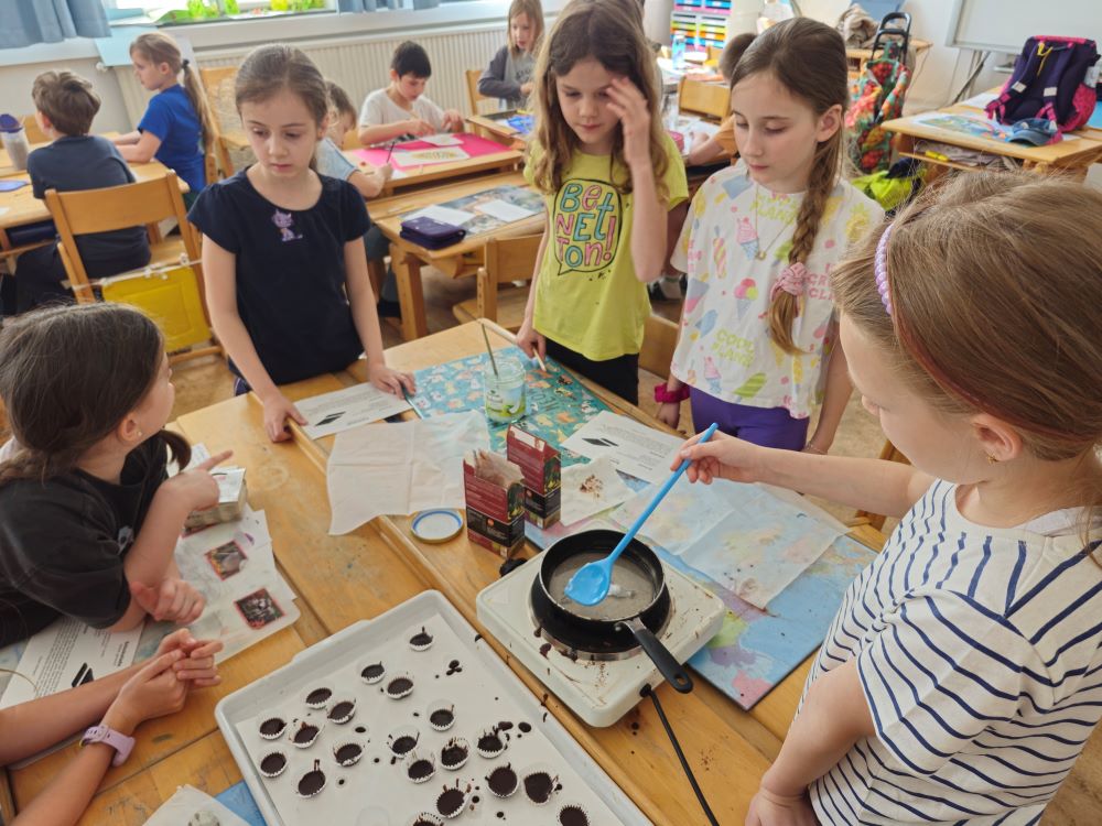 ReferentInnen von „Südwind“ besuchten unsere Schule und ermöglichten den Kindern aller Klassen einen Einblick in die Herstellung von Schokolade. Die SchülerInnen lernten einiges über den Anbau von Fairtrade Kakao und sie durften sogar Schokolade-Pralinen herstellen. Die waren lecker!